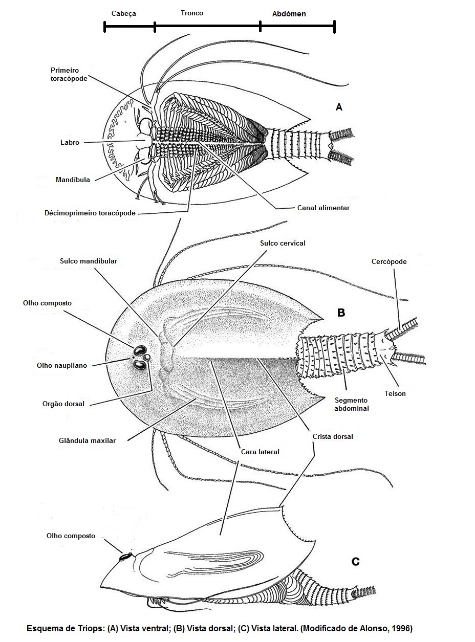 O género Triops é assim chamado pelo fato de possuir 3 olhos (2 olhos compostos e 1 naupliano). Estes animais possuem também cerca de 50 pares de apêndices designados de toracópodes. Estes toracópodes, tal como em todos os branquiópodes têm várias funções, ou seja, alguns servem para a respiração (brânquias nos pés), outros ajudam o animal a mover-se (locomoção) e outros ainda ajudam-o a alimentar-se.